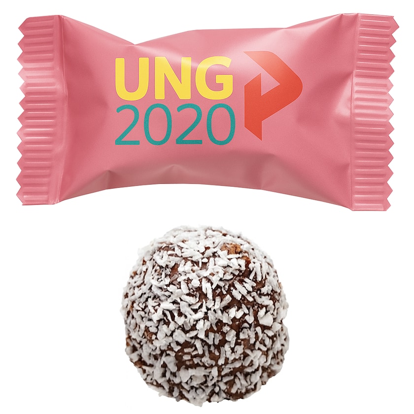 Pieni suklaapallo kustomoitavassa käärepaperissa. Herkullinen suklaapallo on kuorrutettu kaakaolla ja kookoksella. Koko pakkaus painetaan toiveidesi mukaisesti.