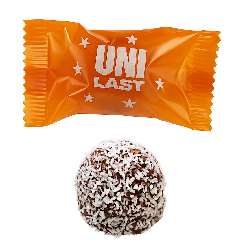 Suuri suklaapallo kookoskuorrutteella. Maukas suklaapallo maistuu kaakaolta ja kookokselta. Koko pakkaus painetaan toiveidesi mukaisesti.
