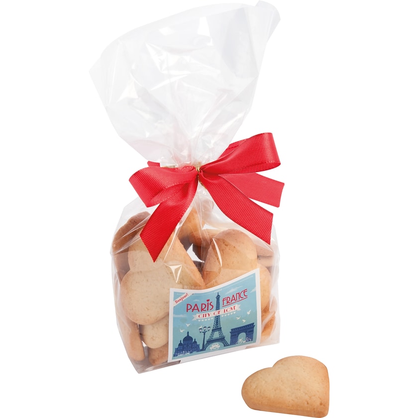 Sydämenmuotoisia voikeksejä nauhalla sidotussa pussissa. Pussin etiketin voi suunnitella itse ja siihen saa digipainatuksen. Rusettinauhan väriksi voi valita ruskean, sinisen tai punaisen.
