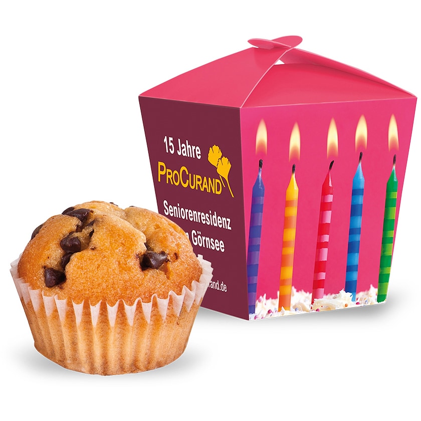 Kustomoitava pahvipakkaus, jonka sisällä on pieni muffini. Saatavilla kolme eri makua. Pakkaukseen saa valokuvapainatuksen.