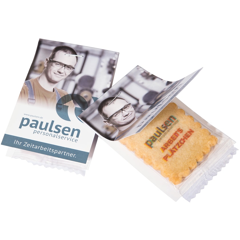 Kustomoitava keksi digipainatetulla mainoskortilla. Voikeksissä on herkullinen vaniljan maku. Sekä kortin ulkopuoli että kakun päällinen digipainatetaan. Kakku painatetaan karamellivärillä. Hauska ja herkullinen mainos!