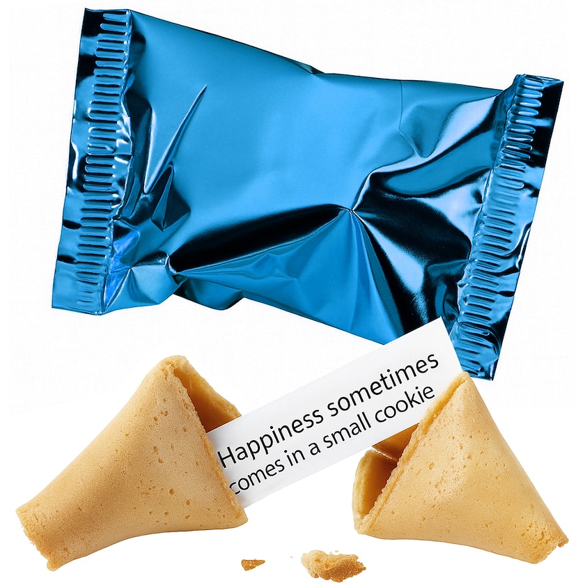 Onnenkeksit ilman painatusta. Voit päättää 5 eri tekstiä, jotka painetaan keksien sisälle tuleviin viesteihin. Kirjoitus saa sisältää 125 merkkiä (välilyönnit mukaanluettuina). Tekstit painetaan mustalla värillä. Foliokääreeseen ei saa painatusta.