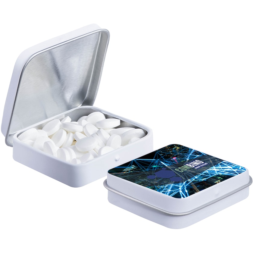 Raikastavia minttupastilleja metallirasiassa. Koko kannen alalle saa digipainatuksen. Pastilleilla on 36 kuukauden säilyvyysaika.
