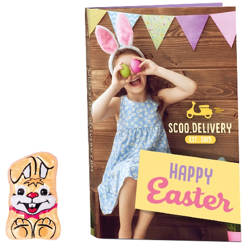 Kortti, jonka sisällä on pieni suklaapupu. Koko kortti digipainatetaan toiveidesi mukaisesti. Kortissa on reilusti tilaa isommalekin mainokselle!
