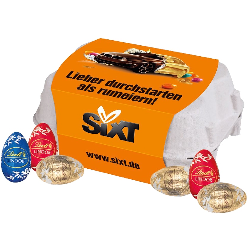 Kuusi Lindt-suklaamunaa klassisessa munakennossa. Pakkaus sisältää sekoituksen eri makuisia suklaamunia. Kennon pohjalla on paperiruohoa. Painatus tehdään kartonkivyötteeseen, joka tulee munakennon ympärille.