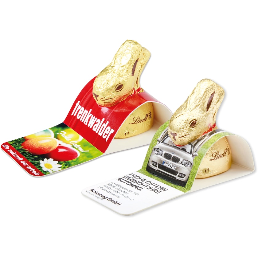Lindt-suklaapupu paperietiketillä, johon saa oman painatuksen. Etiketti on tuotettu FSC-merkitystä paperista ja painetaan täysin toiveidesi mukaisesti. Pupu on valmistettu hienoimmasta maitosuklaasta. Pääsiäissesongin supersuosikki!