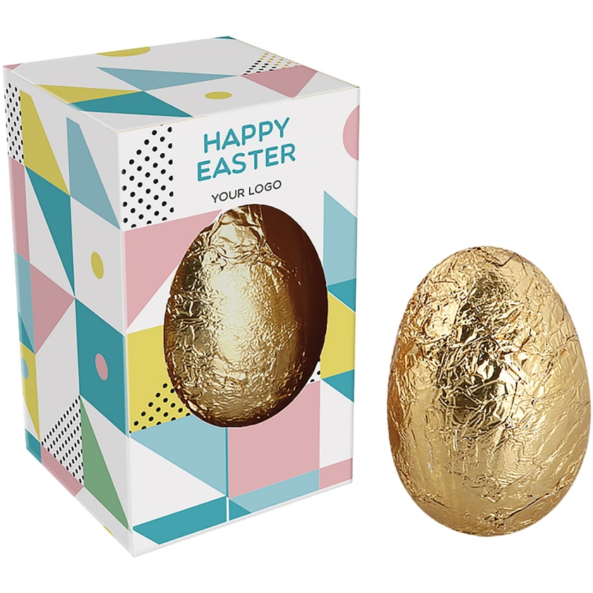 Pieni suklaamuna, joka on kääritty kultaiseen folioon. Koko pakkaus painetaan toiveidesi mukaisesti. Suklaamuna on valmistettu laadukkaasta maitosuklaasta. Loistava kampanjalahja pääsiäiseksi!