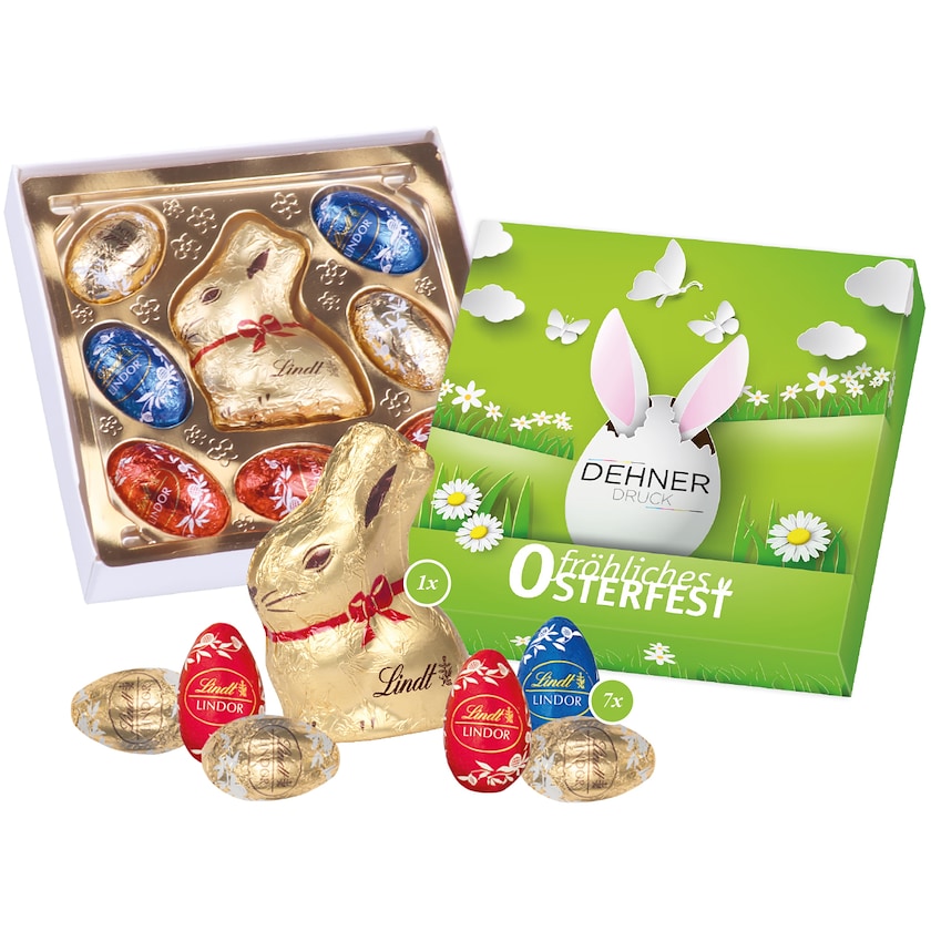Suklaarasia, joka sisältää Lindt-pääsiäissuklaata. Yllätä asiakkaasi! Konvehtirasia on valmistettu ilmastoneutraalisti FSC-sertifioidusta paperista ja sisältää 42 grammaa ensiluokkaista suklaata.