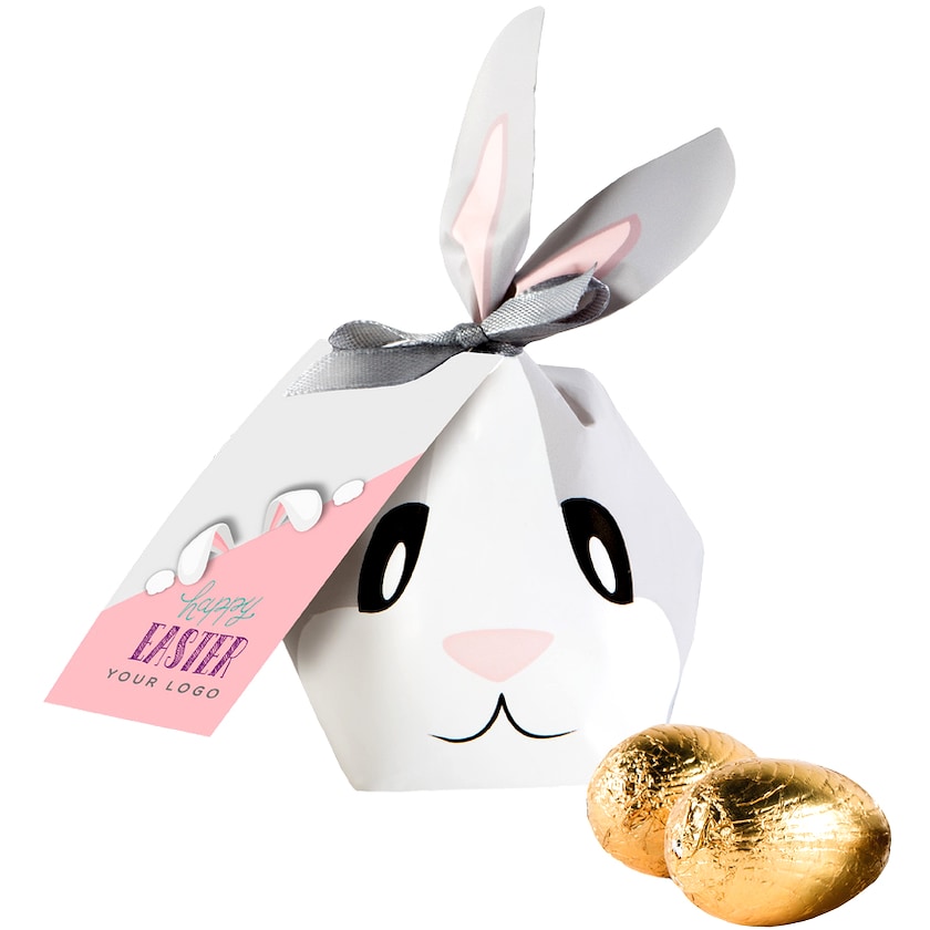 Suloinen pääsiäispupun muotoinen pussi, joka sisältää 5 suklaamunaa. Suklaamunissa on kultainen foliokääre ja ne painavat yhteensä 50 g. Pussin mukana tulee kortti, jonka etupuoli painetaan toiveidesi mukaisesti.