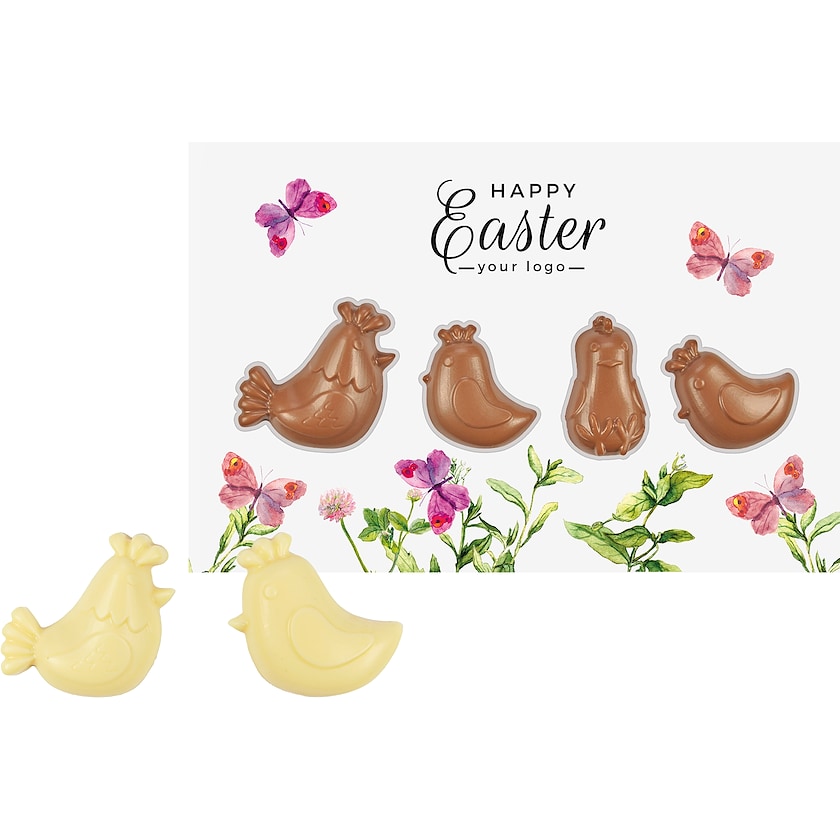 Neljä suklaakanaa kustomoitavassa pakkauksessa. Suklaan paino yhteensä 30 grammaa. Valittavana maitosuklaa tai valkosuklaa. Korttiin tehdään digipainatus.