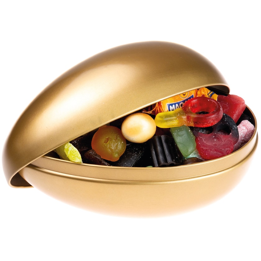 Upea metallinen pääsiäismuna, joka sisältää herkullisia irtokarkkeja ja suklaakaramelleja. Moderni pääsiäismuna nykyaikaisille yrityksille!