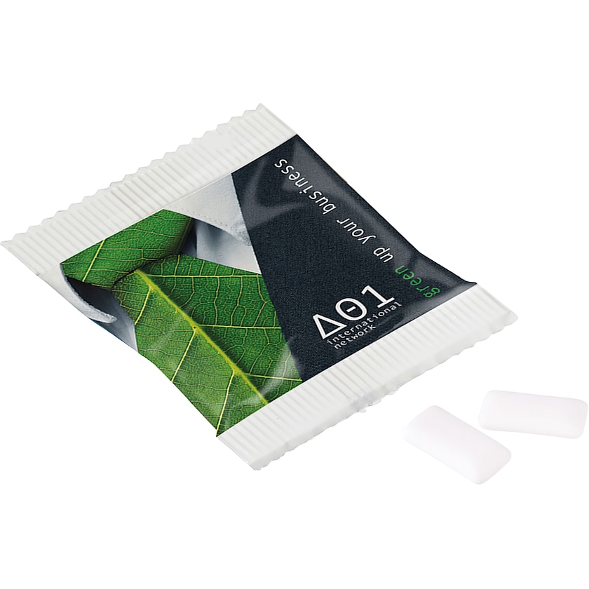 Paperinen purukumipakkaus omalla painatuksella. Sims sisältää kaksi sokeritonta mintunmakuista purukumia.