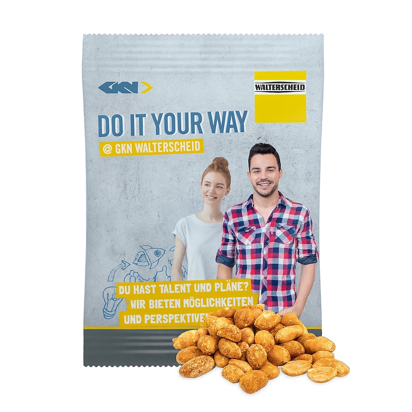 Hunajapaahdetut, suolaiset maapähkinät kustomoitavassa pussissa. Koko pussi painetaan toiveidesi mukaisesti. Pussin pohjaväri on valkoinen.