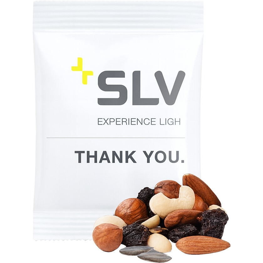 Ihana pähkinäsekoitus kustomoitavassa pakkauksessa. Sisältää cashewpähkinöitä, manteleita, rusinoita, hasselpähkinöitä, kurpitsansiemeniä sekä maapähkinöitä. Koko pakkauksen alalle saa painatuksen.