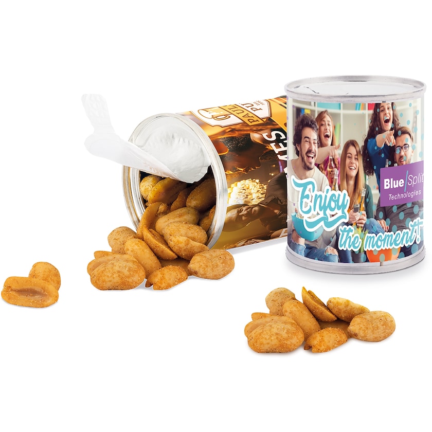 Avaa ja nauti! Purkki täynnä houkuttelevia snackseja. Valittavana maut Roasted peanuts sekä Cashew peanuts mix. Purkin ympärille saa oman painatuksen.