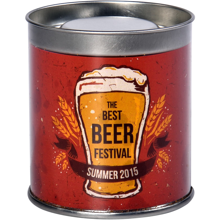 40 gramman partymix-sekoitus metallipurkissa. Purkin ympärillä on digipainatettu paperietiketti. Juhlat voivat alkaa!