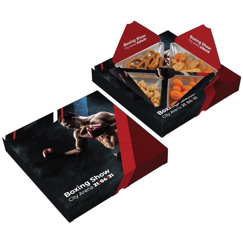 Neljän snacksin pakkaus. Koko pakkaus painetaan toiveidesi mukaisesti. Sisältää 75 grammaa minipretzeleitä, riisikeksejä, maapähkinöitä ja paahdettuja kikherneitä.