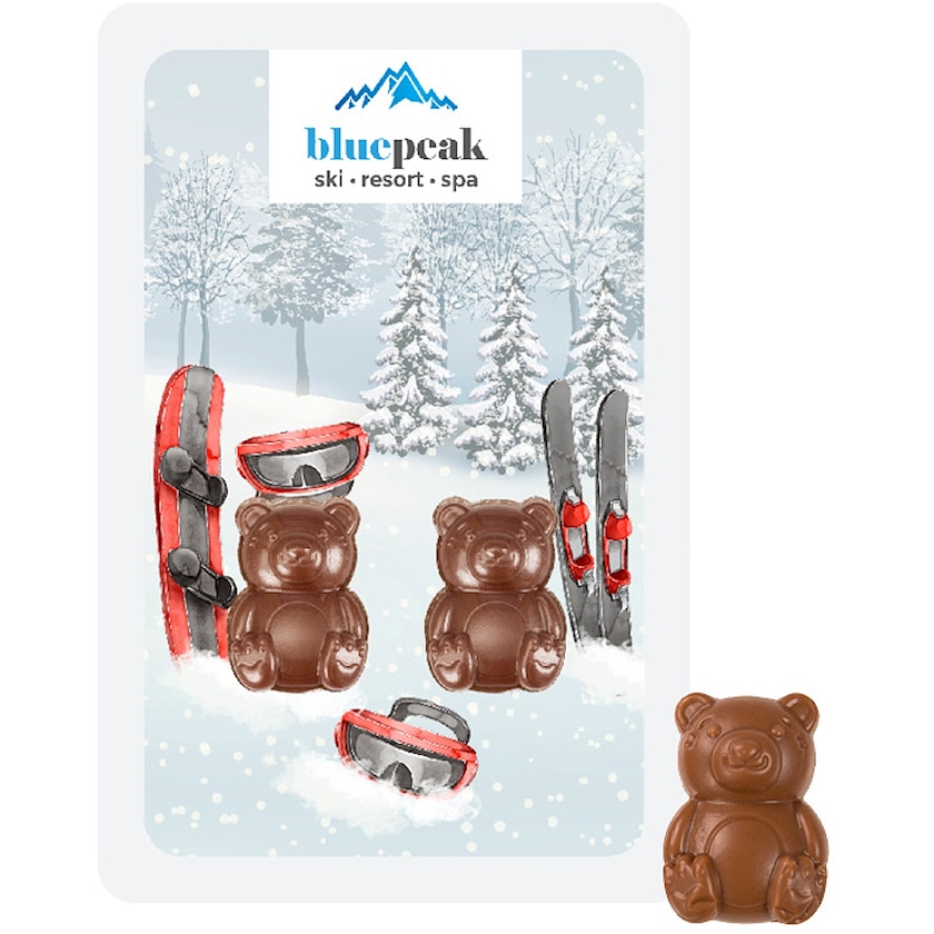 Kaksi suloista suklaakarhua mainoskortissa. Koko kortti digipainatetaan toiveidesi mukaisesti. Kaikkien lasten suosikki!