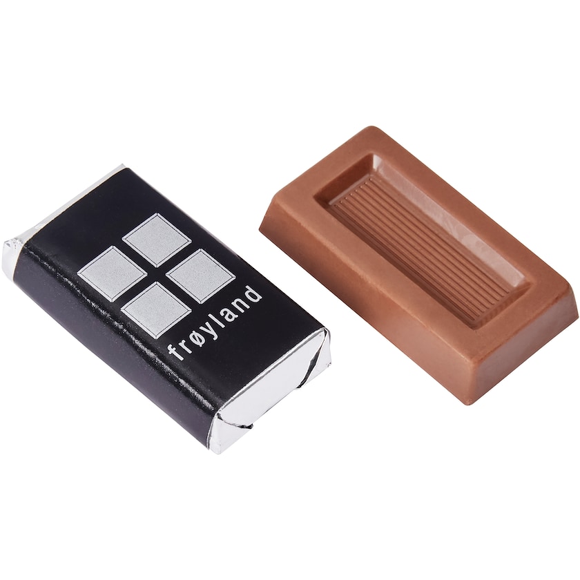 5 gramman maitosuklaaneliö digipainatuksella, minimitilaus vain 500 kpl. Suklaan päällä on hopeafolio ja paperikuori, jonka voit suunnitella itse.