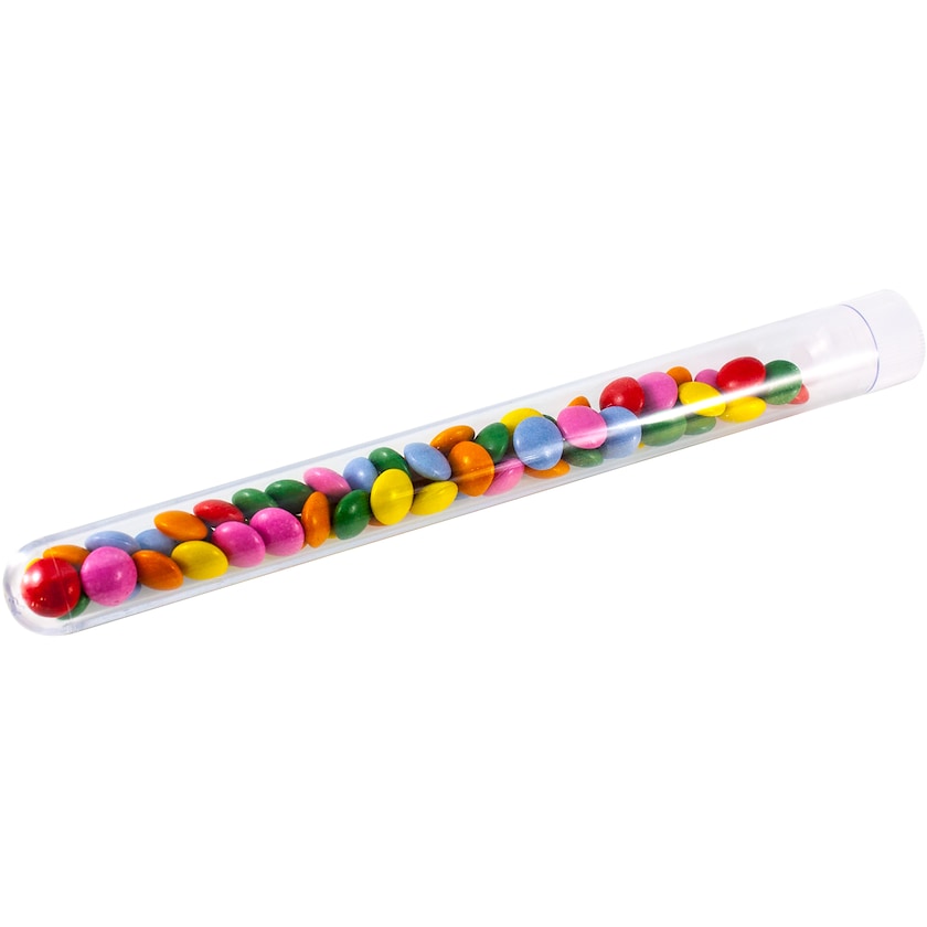 Läpinäkyvä koeputki, jossa 13 g suklaapastilleja. Nämä mainoskarkit herättävät huomiota. Tilaa suklaapastillit koeputkessa Axon Profililta!