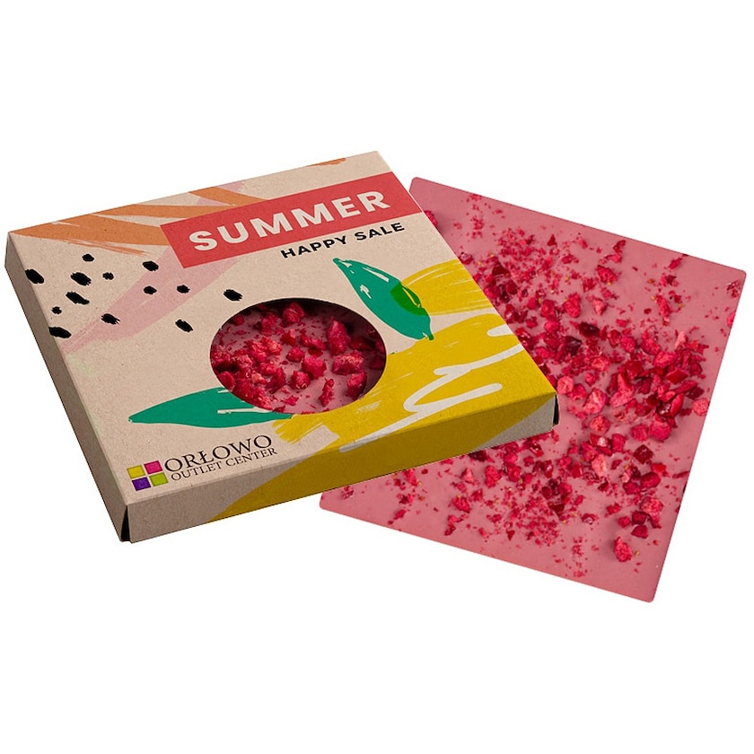 Ylellinen suklaalevy, joka on saatavilla 4 erilaisesta suklaasta valmistettuna ja 9 erilaisella lisukkeella. Valitse suklaatyyppi sekä siihen sopiva lisuke, ja luo persoonallinen mainossuklaa yrityksellesi. Koko pakkauksen ulkonäön voi suunnitella itse.