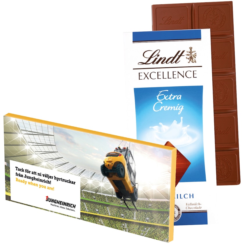 Laadukas 100 gramman suklaalevy Lindt Excellence digipainatetussa pahvipakkauksessa. Valitse neljästä eri mausta. Suklaa on pakattu alkuperäiseen pakkaukseensa, jonka päälle tulee digipainatettu pakkaus.