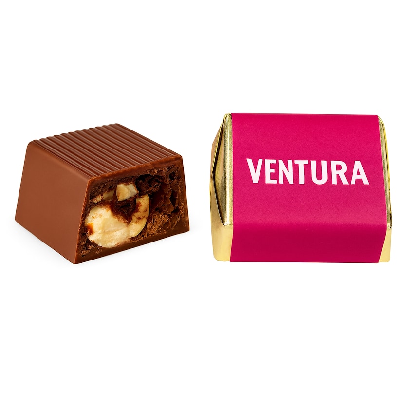 Maitosuklaakonvehti kokonaisella hasselpähkinällä. Suklaa on kääritty kultafolioon, jossa on paperietiketti painatuksellasi. Ihanan kermainen ja herkullinen!