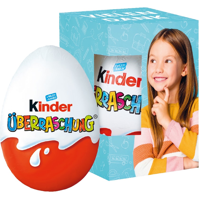 Kinder-munat pahvipakkauksessa painatuksellasi. Lasten suursuosikki! Tässä Kinder-munassa on saksankieliset tekstit.