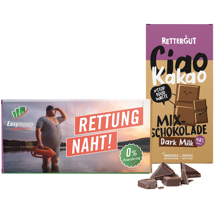Rettegut-suklaalevy, joka on tuotettu ylijäämäsuklaasta. Levyn materiaalina on suklaa, joka on jäänyt yli muusta suklaantuotannosta, ja menisi muuten hukkaan. Koko valmistusprosessi on ilmastoneutraali ja hiilidioksidineutraali. Painatus tehdään pahvipakkaukseen, joka tulee alkuperäisen Rettergut-pakkauksen päälle.