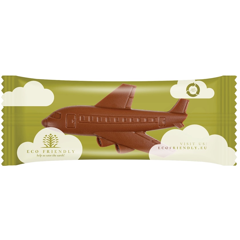 Lentokoneen muotoinen suklaa, jonka käärepaperi on biohajoavaa materiaalia. Makeinen on saatavilla maitosuklaana, valkosuklaana tai tummana suklaana. Koko pakkauksen alalle saa painatuksen 1-4 värillä.