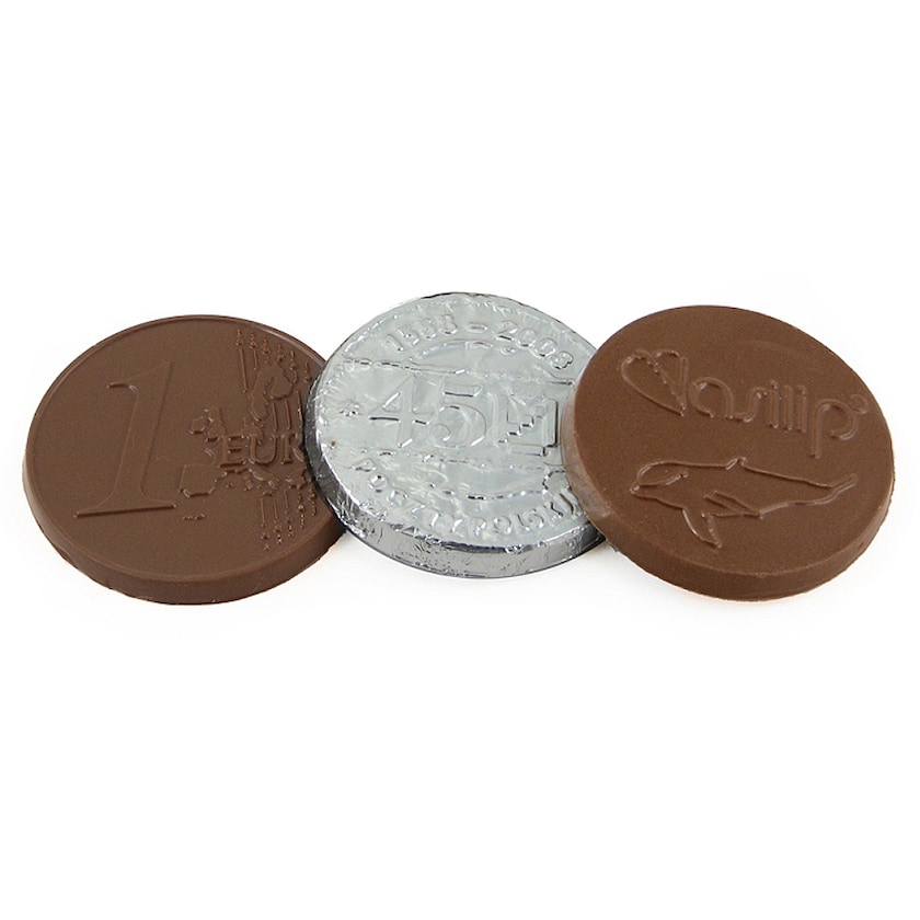 Suuret suklaakolikot, joissa saa logopainatuksen suklaaseen. Suklaakolikot ovat valmistettu hienosta belgialaisesta suklaasta. Valitse kullan- tai hopeanvärinen käärepaperi.