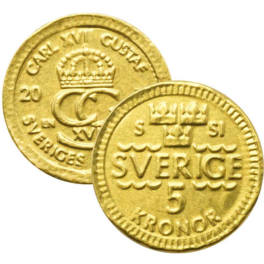 Ruotsalaisen viiden kruunun kolikon muotoinen suklaaraha. Suklaaraha valmistettu herkullisesta maitosuklaasta vähintään 28 % kaakaopitoisuudella.