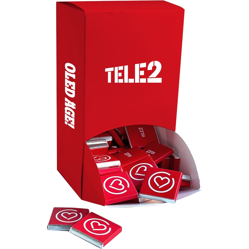 Pahvilaatikko täynnä suklaaneliöitä. Sekä pahvilaatikko että suklaaneliöt painatetaan toiveidesi mukaan. Valitse maitosuklaa 32 % tai tumma suklaa 70 %.