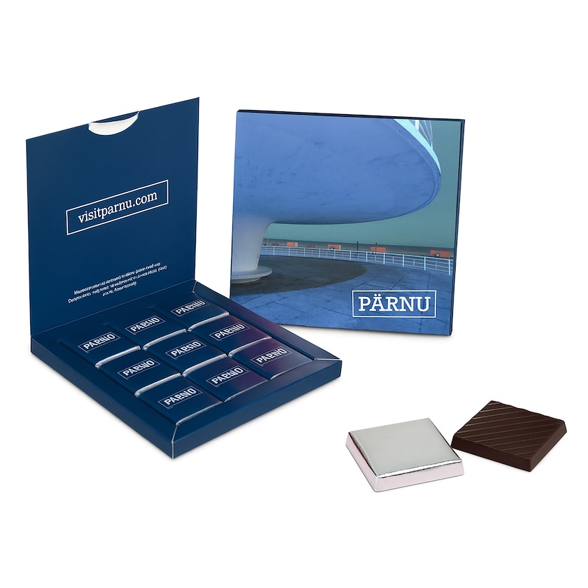Täysin kustomoitava 9 konvehdin suklaarasia. Konvehdit voi valita tummana, valko- tai maitosuklaana. Sekä rasia että suklaiden käärepaperit painetaan toiveidesi mukaisesti.