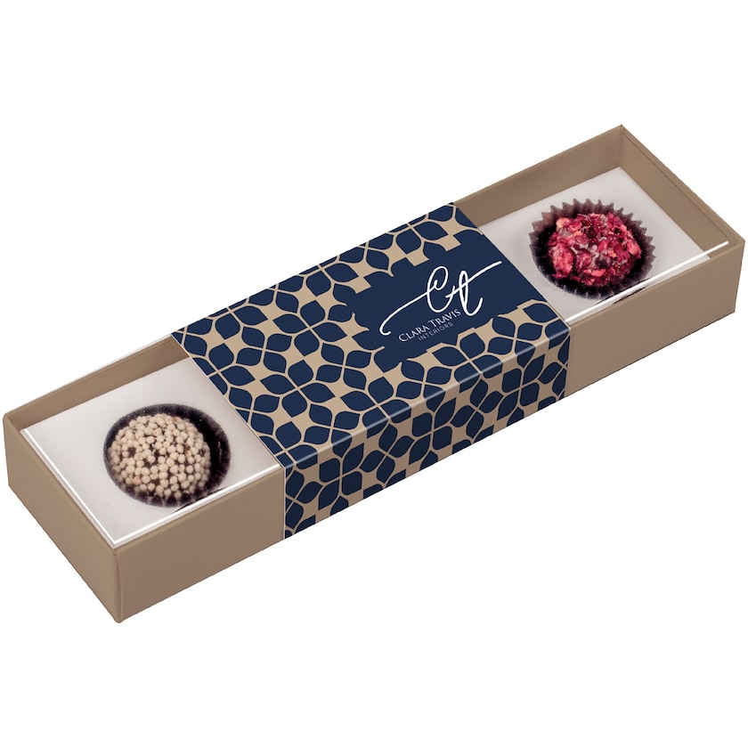 Rasia, joka sisältää neljä fantastista suklaakonvehtia. Rasia sisältää satunnaisen sekoituksen eri makuja, jotka näkyvät kolmannessa tuotekuvassa. Pakkauksen ympärille tulee paperivyöte, joka painetaan täysin toiveidesi mukaisesti.