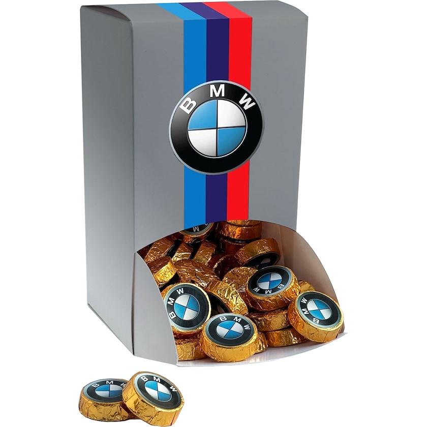 Suuri pahvilaatikko täynnä pyöreitä suklaapaloja kultafoliolla. Suklaapalat ovat valmistettu korkealaatuisesta suklaasta, jonka kaakaopitoisuus on vähintään 50 %. Pahvilaatikon ulkopinta painatetaan kokonaan toiveidesi mukaan. Suklaapalojen etiketit varustetaan painatuksellasi.
