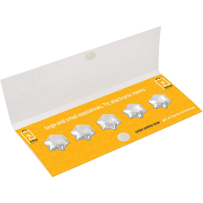 Viisi laadukasta maitosuklaasydäntä pahvipakkauksessa. Folioväriksi valittavissa kulta, hopea tai punainen.