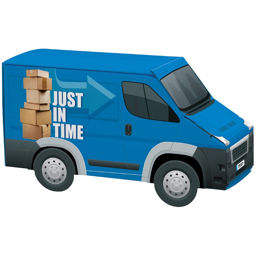 Kustomoitava pakettiauto, jonka sisällöksi voi valita karkkia tai suklaata. Pakettiauto on valmistettu FSC-sertifioidusta paperista, ja koko pakkaus painetaan toiveidesi mukaisesti. Sisällön voi valita seuraavista vaihtoehdoista: Mentos chewy candy (36,5 grammaa, 12 kuukauden säilyvyys), Ritter Sport chocolate bites (60 g, 6 kk säilyvyys) tai Lindt Lindor milk balls (50 g, 6 kk säilyvyys).