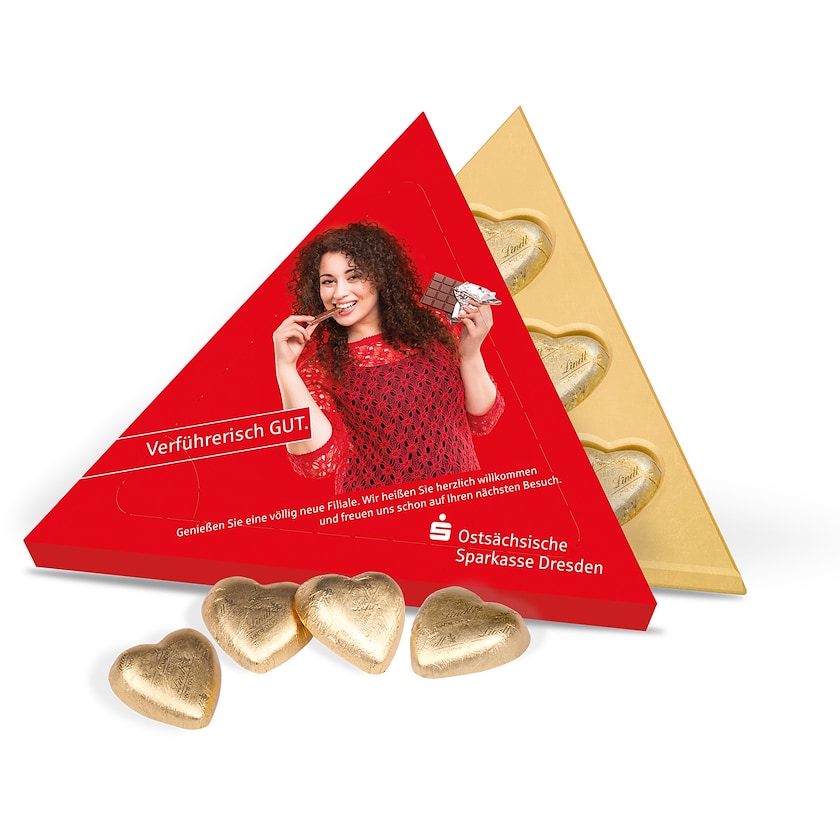 Lindt-suklaasydämiä kolmion muotoisessa pakkauksessa. Makeisiin voi valita punaisen tai kultaisen foliokääreen. Lataa painomalli ja suunnittele uniikki suklaarasia!