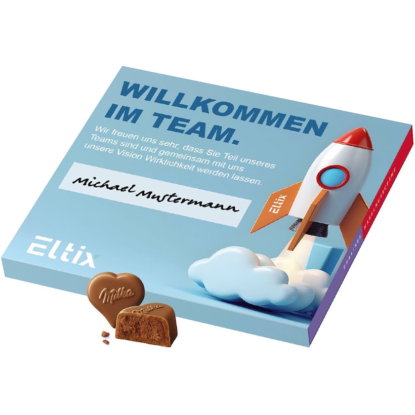Suuri suklaarasia, jossa 110 grammaa sydämenmuotoisia suklaapraliineja. Suklaapraliinit on valmistettu maitosuklaasta ja täytetty herkullisella hasselpähkinäkreemillä. Koko rasian painatus tehdään toiveidesi mukaan.