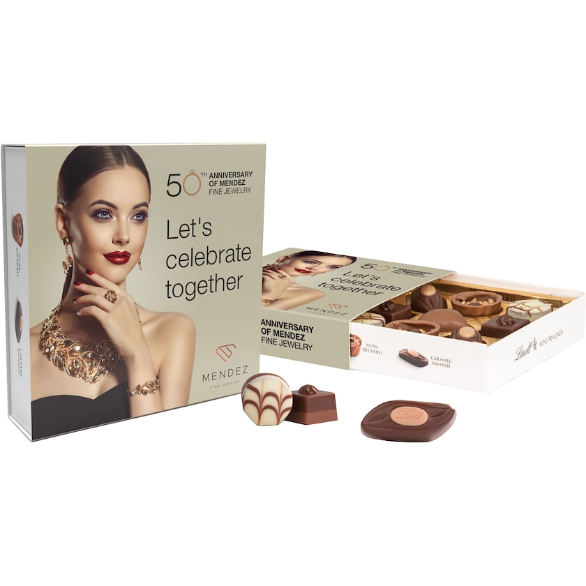Yhdeksän ylellistä Lindt-suklaakonvehtia lahjarasiassa. Kansi on läpinäkyvä, ja siihen painetaan kansipaperi toiveidesi mukaisesti.