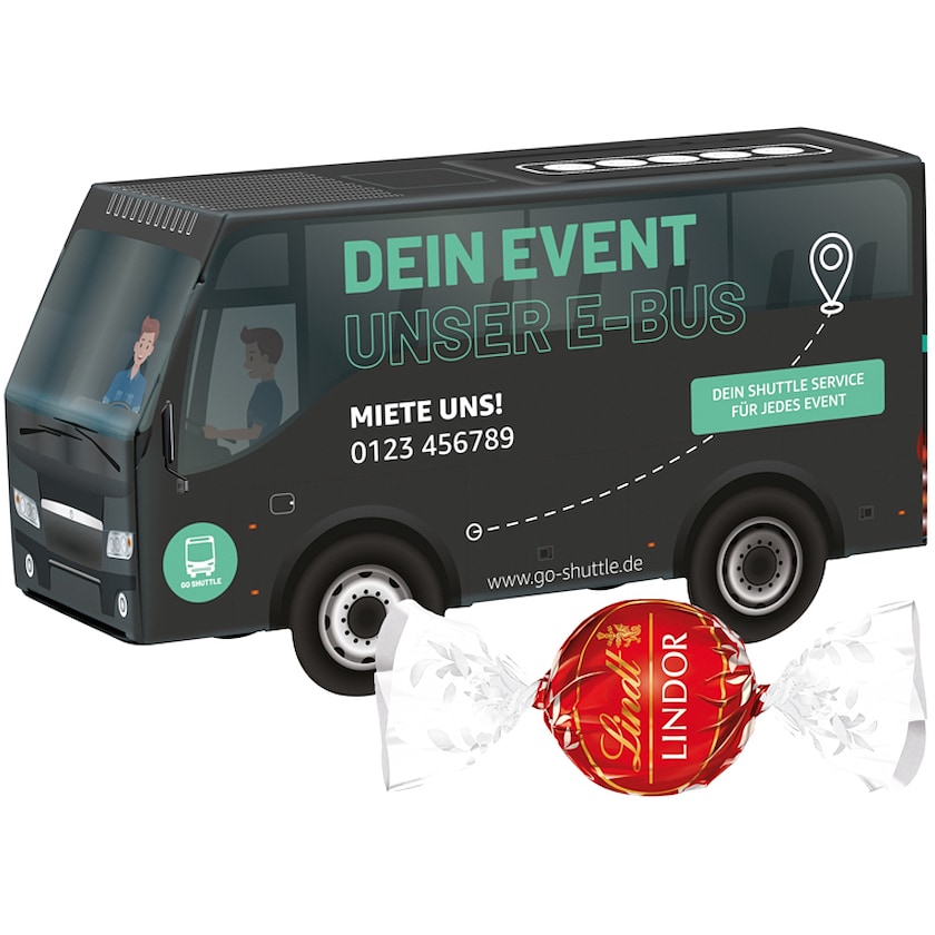 Kartonki bussi täynnä Lindt Lindor-suklaakonvehteja. Sisältää 3 kpl suklaakonvehtia. Koko pakkaus painatetaan toiveidesi mukaisesti. Pakkaus on valmistettu ympäristömerkitystä paperista.