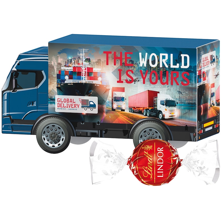 Kartonki kuorma-auto, joka on täynnä kolmea Lindt Lindor-suklaakonvehtia. Koko ulkopinta painatetaan toiveidesi mukaan. Valmistettu ympäristömerkitystä paperista.