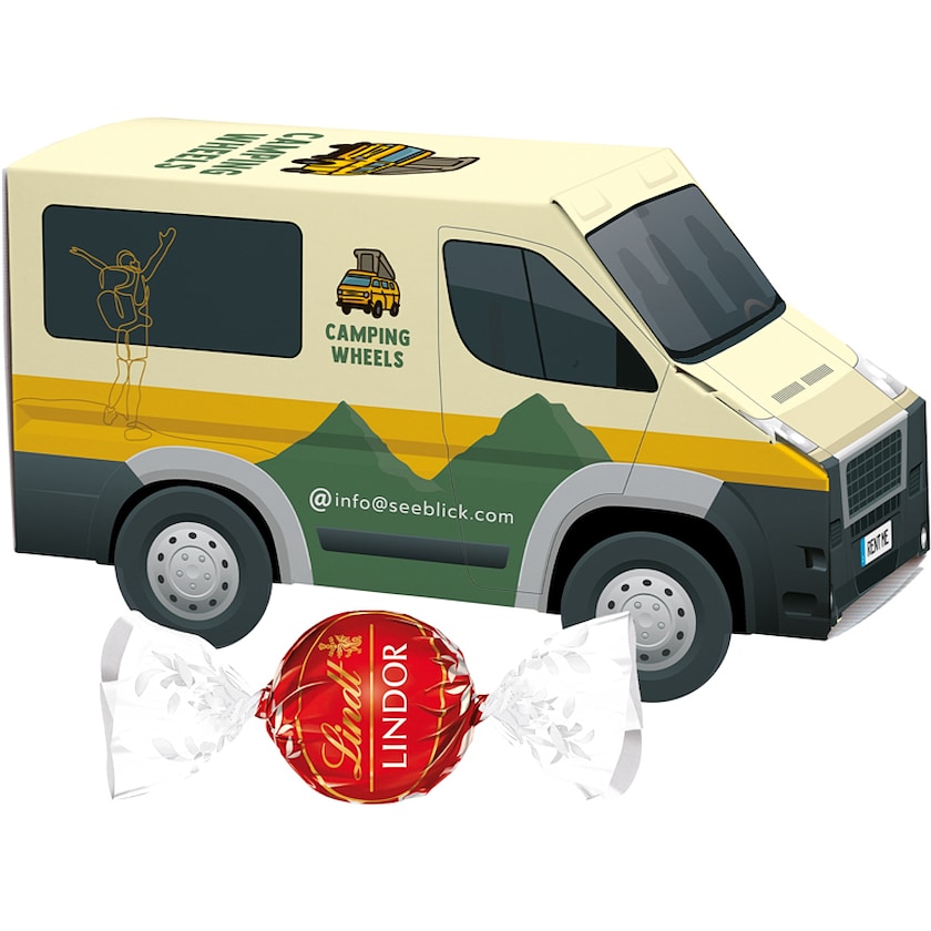 Kartonki pakettiauto, joka on täynnä kolmea herkullista Lindt Lindor-suklaakonvehtia. Pakkaus on valmistettu ympäristömerkitystä paperista. Pakkauksen koko ulkopinta painatetaan toiveidesi mukaisesti.