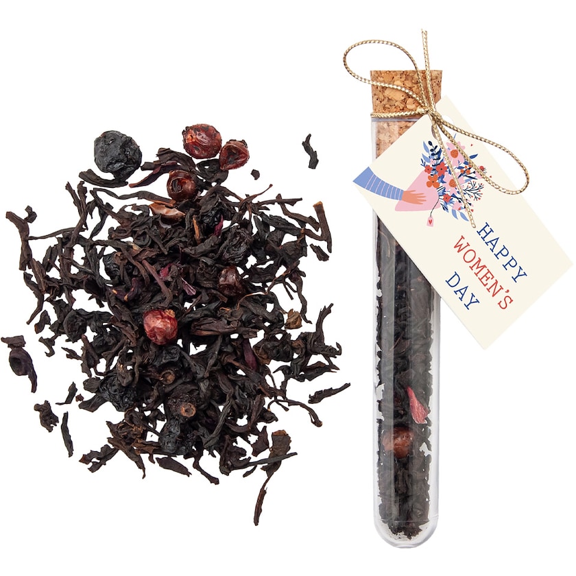 Koeputki, joka sisältää mustaa irtoteetä. Tee on maustettu mustaherukoilla. Koeputki on muovia ja sen korkki on aitoa korkkia. Painatus tehdään mainoskorttiin, joka kiinnitetään korkkiin kulta- tai hopeanauhalla.