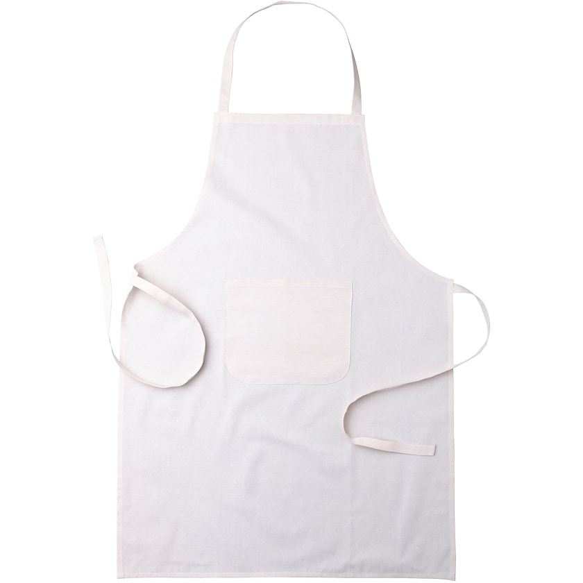 Luonnonvaalea puuvillainen esiliina. Edessä iso tasku. Valmistettu 150 gramman puuvillakankaasta.