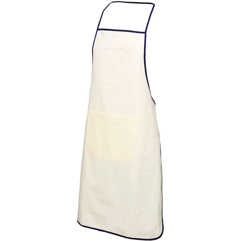 Luonnonvärinen esiliina 100% puuvillasta. Esiliinan reunat ja narut on kontrastivärissä. Tilaava tasku etupuolella.