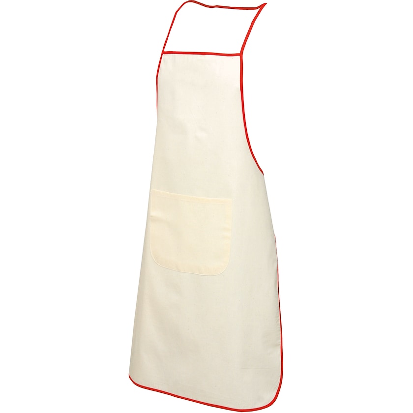Luonnonvärinen esiliina 100% puuvillasta. Esiliinan reunat ja narut on kontrastivärissä. Tilaava tasku etupuolella.