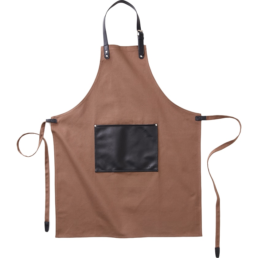 Puuvillakangasesiliina vegaanisilla nahkayksityiskohdilla. Edessä on iso tasku. Ylellinen esiliina, joka vain paranee ajan myötä.