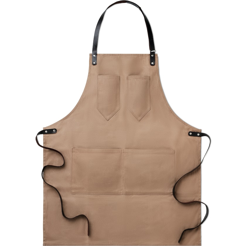 Huippulaadukas nahkainen esiliina. Esiliinassa on kaksi rintataskua ja kaksi isompaa taskua helmassa. Erinomainen valinta, mikäli etsit laadukasta nahkaesiliinaa painatuksella!